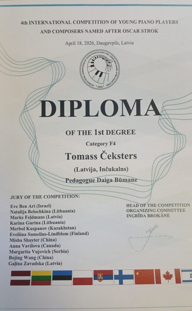 Lepojamies! Mūsu skolas audzēknis Tomass Čeksters ieguvis Pirmo vietu IV Oskara Stroka Jauno pianistu un komponistu konkursā ar savu komponēto skaņdarbu “Tumši zils” no cikla “Astoņu krāsu varavīksne”. Apsveicam arī Tomasa skolotāju Daigu Būmani!